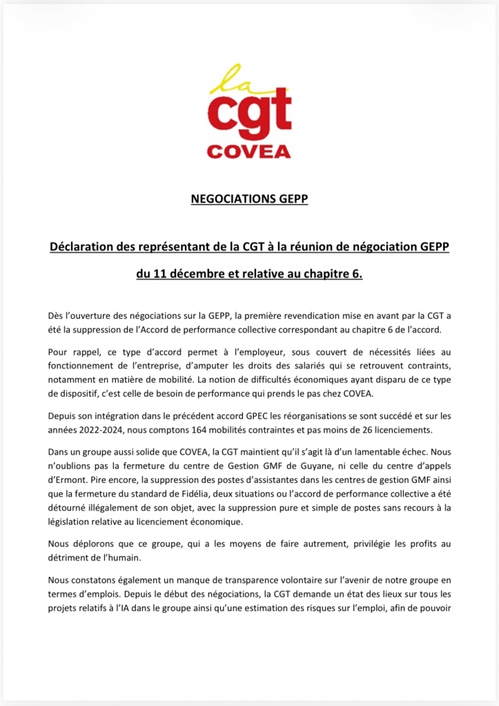 Nous n’avons jamais signé cet accord par le passé car il dispose d’un chapitre 6 dans lequel a été sournoisement intégré un Accord de Performance Collective qui permet à COVEA d’user de mobilités contraintes, voire de licencier les salariés qu’elle n’arrive pas à recaser. Ce fut le cas lors de la fermeture du standard chez Fidélia.