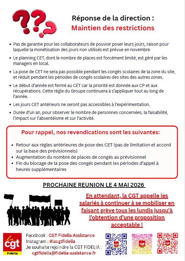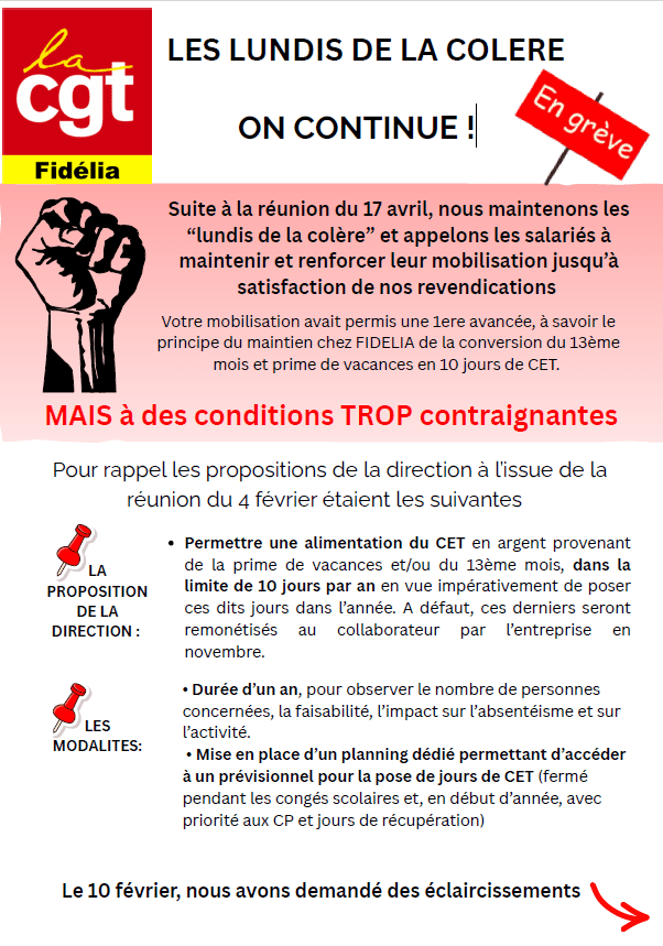 La CGT défend vos droits LES LUNDIS DE LA COLERE – ON CONTINUE ! Date: 17 avril 2026Author: CGT Fidélia Partager : Partager sur Facebook(ouvre dans une nouvelle fenêtre) Facebook Partager sur X(ouvre dans une nouvelle fenêtre) X J’aime chargement…